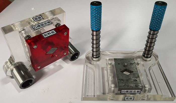 把板材料沿直線彎成各種形狀,可以加工形狀較復(fù)雜的零件。 以菱形工件作為導(dǎo)料,彎曲高度不小于10 mm,產(chǎn)品自動從凸模脫落。 |