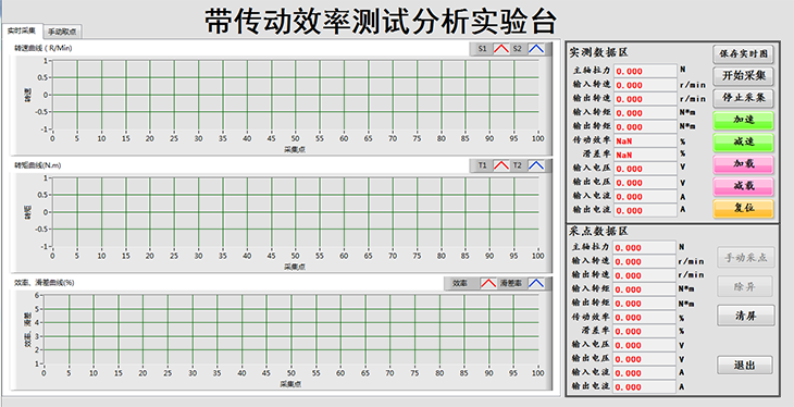 3、采用傳感器和A/D采集并轉(zhuǎn)換成主動帶輪和從動帶輪的驅(qū)動力矩和阻力矩數(shù)據(jù),采用角位移傳感器和A/D板采集并轉(zhuǎn)換成主、從動帶輪的轉(zhuǎn)數(shù)。最后輸入計算機(jī)進(jìn)行處理作出滑動曲線和效率曲線;
