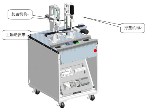 接收上一工作站填裝好顆粒的瓶子,當瓶子被輸送到加蓋機構后,主輸送皮帶停止,夾蓋定位夾緊機構將瓶子固定,加蓋機構啟動加蓋流程,將蓋子加到瓶子上;加好蓋子后主輸送皮帶啟動,加上蓋子的瓶子繼續(xù)被送往擰蓋機構,到擰蓋機構下方,主輸送皮帶停止,擰蓋定位夾緊機構將瓶子固定,擰蓋機構啟動,將瓶蓋擰緊,主輸送皮帶啟動,將擰好蓋子的物料瓶輸送到下一工位。瓶蓋分為白色和黑色兩種。