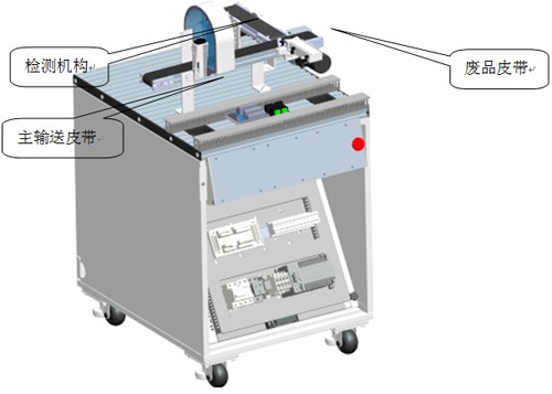 主皮帶運行,接收上一站擰好蓋后的物料瓶子,當物料瓶經(jīng)過檢測機構時:回歸反射傳感器檢測瓶蓋是否擰緊;檢測機構檢測瓶子內(nèi)部顆粒是否符合要求;對擰蓋與顆粒均合格的瓶子進行瓶蓋顏色判別區(qū)分;擰蓋或顆粒不合格的瓶子被分揀機構推送到廢品皮帶上(短皮帶);擰蓋與顆粒均合格的瓶子被輸送到皮帶末端,等待機器人搬運。