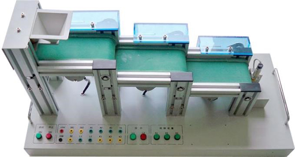模型主要由漏斗上料裝置、三級(jí)傳送帶、直流電機(jī)、電磁鐵、電容傳感器、開關(guān)、指示燈、鋁型材框架、安裝底板、手柄等組成,通過PLC編程,可完成自動(dòng)送料裝車系統(tǒng)的模擬控制。 |