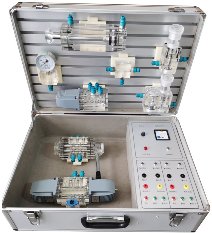 3、箱子集元件元件、液壓泵站、調(diào)速電機(jī)及電氣控制部分為一體箱,教師可方便的將設(shè)備帶入課堂進(jìn)行現(xiàn)場演示教學(xué)和實(shí)物講解。